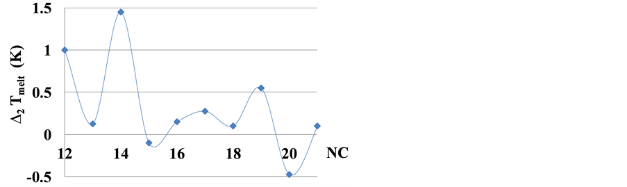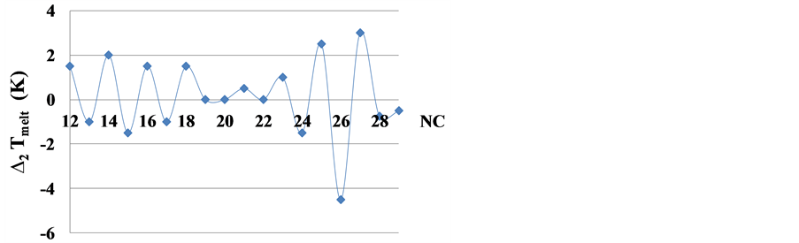Roberts and Caserio [12] used the first differential to illustrate the zigzag dependence of the melting temperature in n-alkanes, but we think that the second differential demonstrates better the deviation of triple point temperatures in n-alkanes from their regular dependence.