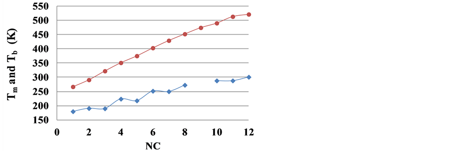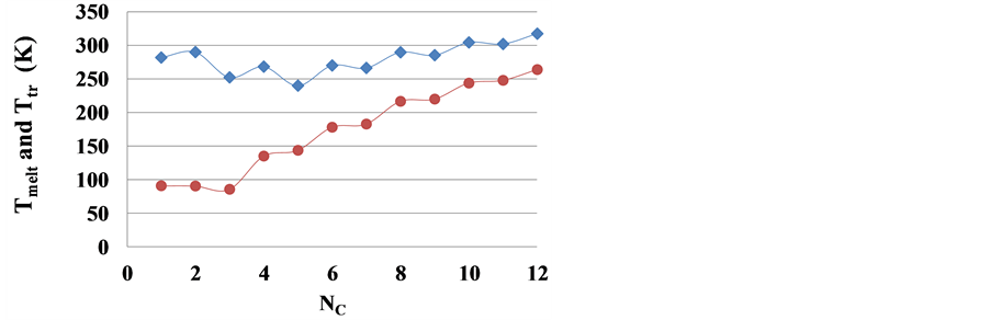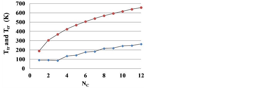 Here the triple point temperature dependence on the number NC of C atoms in a molecule had been studied utilizing the NIST database [9] data. For n-undecane the melting temperature from the Vargaftik’s Handbook was used [10] . In this case the difference between melting temperature and triple point temperature for a substance under investigation is not too high and these values can be considered as the same thermophysical property.