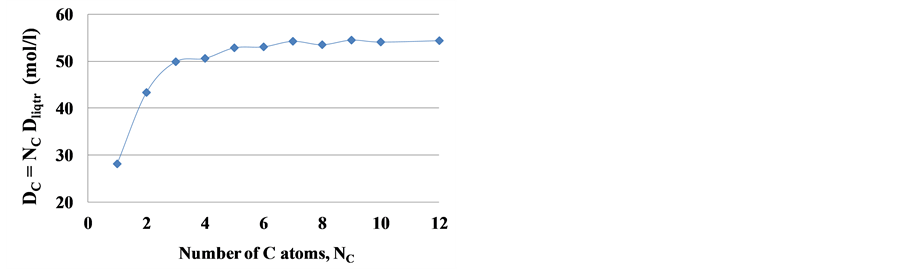 Here Dliqtr is the molar density of a liquid n-alkane at its triple point. For the carbon atoms’ molar density DC in liquid n-alkanes at their triple points it is possible to see the zigzag oscillating dependence on the number NC of C atoms in a molecule, Figure 1.