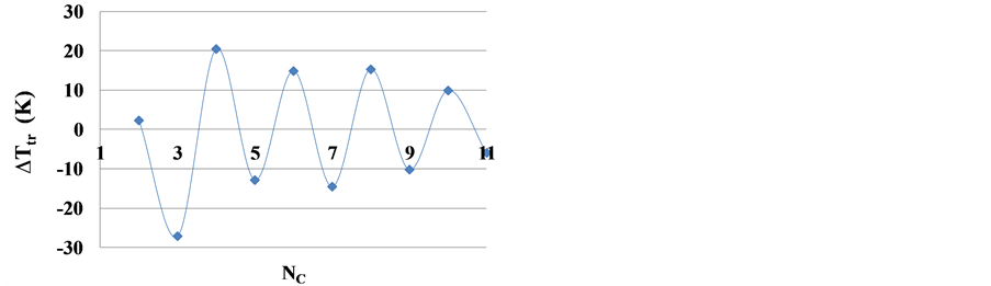 Figure 3. The Ttr(NC) deviation from the nearest average value (Ttr(NC − 1) + Ttr(NC + 1))/2, demonstrating a high amplitude of Ttr oscillations in a series of normal alkanes.