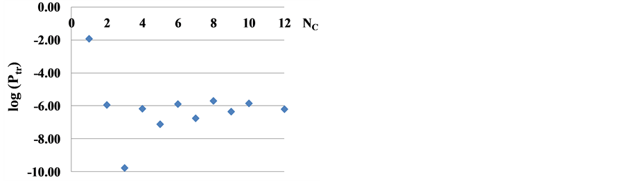 Figure 4. The zigzag dependence of the triple point vapor pressure Ptr for normal alkanes on the C atoms number NC in a molecule.