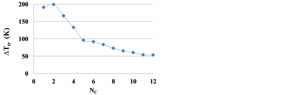 We see that zigzag oscillations of two curves are similar. It tells about almost the same contribution of the Cn−1H2n−1 tails of n-alkanoic acids’ and n-alkanes’ molecules in the intermolecular bond energy. But there is a strong difference in the regular dependence, growing at small NC due to a growing role of the molecular head parts in the intermolecular bonding. To analyze this regular part, the plot of difference ∆Ttr between two curves versus NC is presented at the Figure 6.