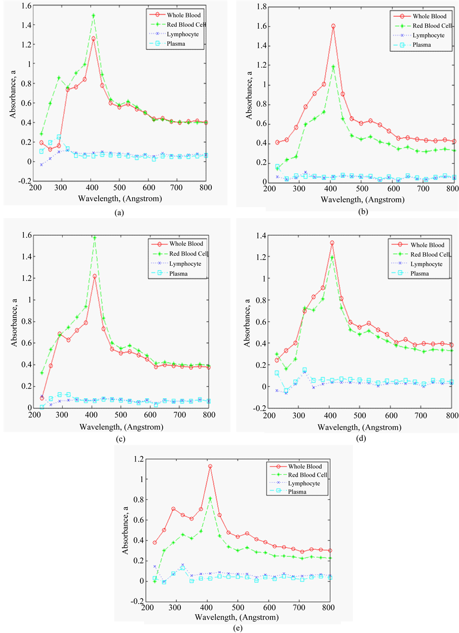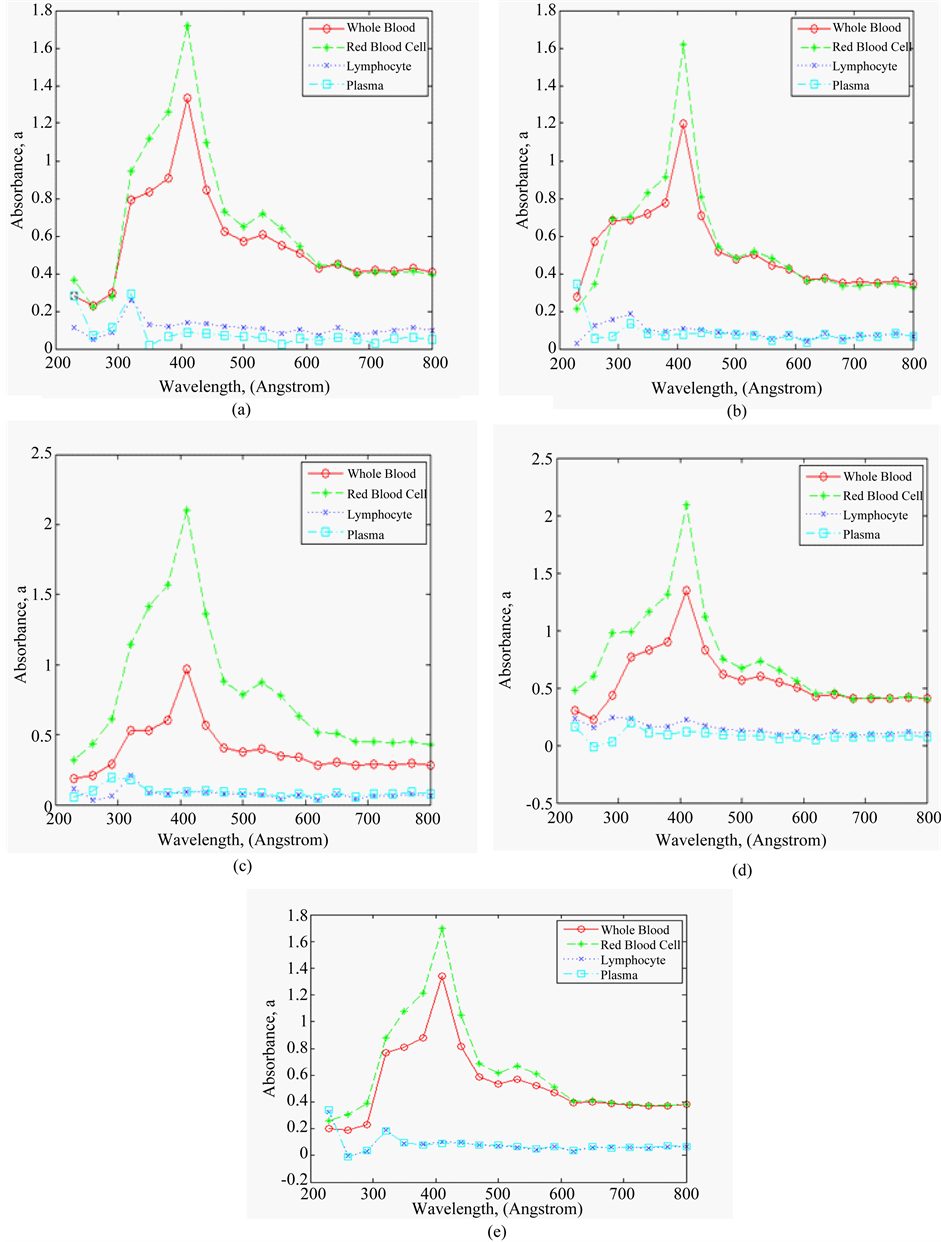 Figure 3. Absorbance, á versus Wavelength, λ for for HIV positive blood components of patients that had not previously commenced antiretroviral treatment. (a) Drug 1: 3TC + NVP + ZDV; (b) Drug 2: TDF + 3TC + EFV; (c) Drug 3: NVP; (d) Drug 4: EFV; (e) Drug 5: 3TC.