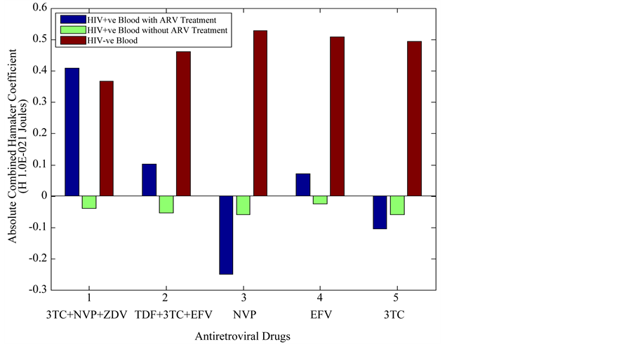 Moreover, the positive values of the absolute combined Hamaker coefficients indicate a van der Waals attraction between the lymphocytes and the antiretroviral drugs in the HIV negative systems.
