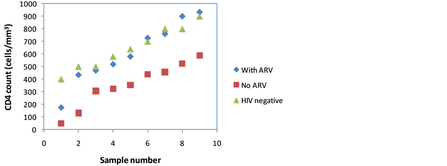 The CD4 counts of blood samples collected from ten HIV infected patients that had commenced ARV treatment (With ARV) and ten HIV patients that had not commenced treatment (No ARV) were initially determined using the CD4 counter (Cytoflowmeter) to ascertain the degree of infection of each blood sample with HIV. The results are given in Figure 1. The CD4 counts of the HIV positive patients who had not commenced treatment (No ARV) are lower than those for HIV positive patients who had commenced treatment (With ARV). Normally, the blood samples of the uninfected patients have higher CD4 counts above 500 cells/mm3. It is noted that details of length of exposure of each patient to HIV or the time when treatment commenced, were not available. We can only say that these drugs have contributed to increased CD4 counts in the patients that took them.