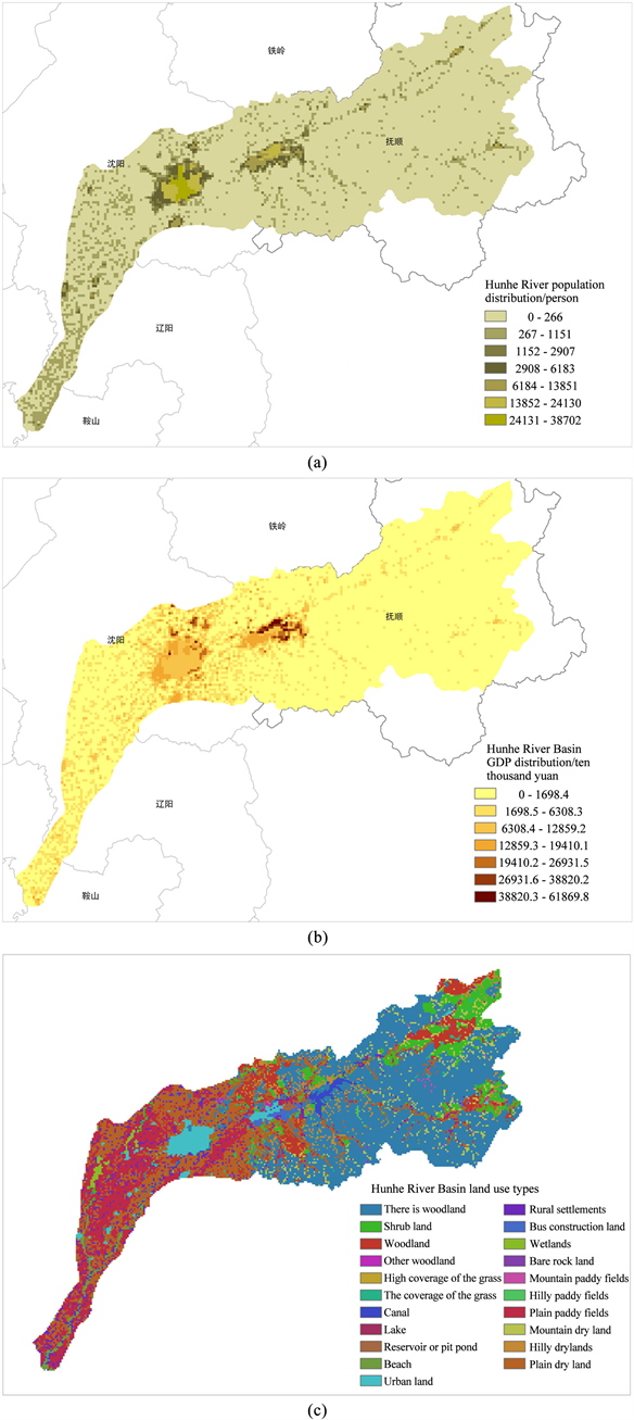 Figure 6. Distribution of population, GDP and landuse in Hunhe River Basin.