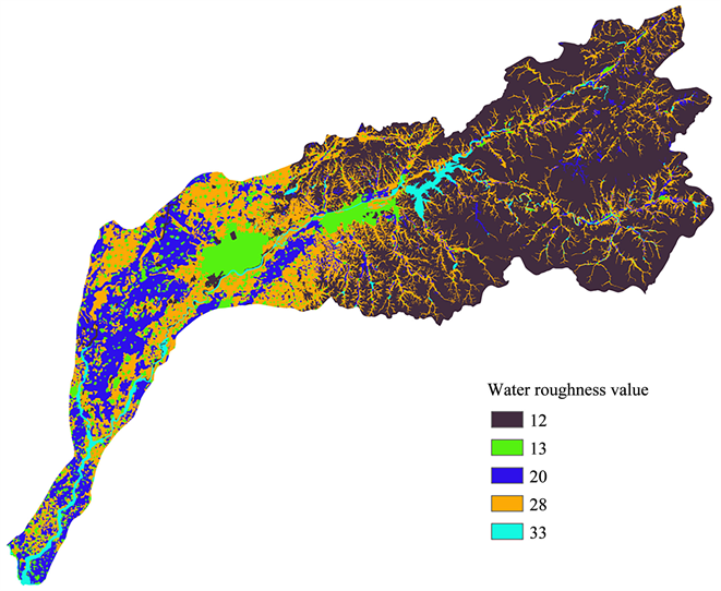 Different land cover forms can intercept, store and filter surface runoff and form different resistivities for flood evolution, which is largely quantified by Mannin roughness [20] . Therefore, when simulating flood flood in the Hunhe River Basin, a comprehensive parameter that can reflect the shape irregularity and roughness of the river channel or gutter wall should also be added to the model. Based on the data of land use types in Hunhe River Basin, this study determined the roughness coefficient of Hunhe River Basin according to the related literature [21] based on the five types of residential land, water body, dry land, irrigated land and forest land (Figure 3). Surface type with larger roughness coefficient has larger water permeability.