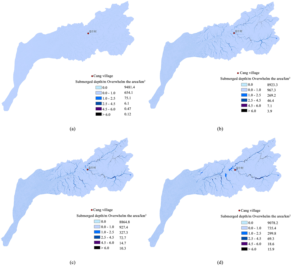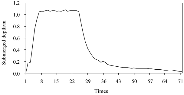 When heavy rains occur in the Hunhe River basin once in a century, submerged depths are below 1.0 m in most areas of the Hunjiang River basin, submerged depths reach 1.0 - 2.5 m in some areas and submerged depths exceed 2.5 m in some areas. The entire rainfall lasted for 24 hours from the beginning to the end, and the sub-flood village located in the upper reaches was submerged at the beginning of the precipitation. After the precipitation stopped, the submergence depth of the Shishushi village gradually decreased (Figure 4).