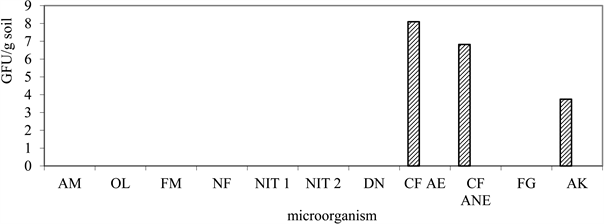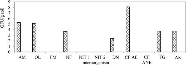In the soil sample of the profile 810 (0 - 5 cm) no beneficial groups of soil microorganisms were found, except for cellulose-fermenting aerobes (108 CFU/g of soil), anaerobes (106 CFU/g of soil), and actinomycetes (103 CFU/g of soil) (Figure 2).
