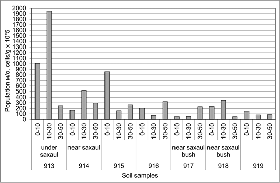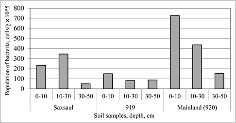 The population varied from 105 cells/g (profiles 901 and 902) to 108 cells/g of the soil (profile 913). This seems to be related to the irregular formation pattern of the soil and the diversity of soil cover on the dried seabed of the Aral Sea. Moreover, as is commonly known, in arid areas, plants have a dual effect on salt content in the upper soil horizons—they both increase and reduce salinity of soil. If the leaf litter is highly saline, as it is the case for saxaul, then the soil salinity increases (Rabotnov, 1992). It is saxaul, which initially occupied the dried seabed of the Aral Sea and shaped the local soil cover formation patterns. A comparison of the total population of microorganisms in soil samples taken on the mainland, near saxaul and on bare land has demonstrated that the mainland is richer in terms of microorganisms at all studied depths. The population of microorganisms is threefold on the mainland as compared to the soil near saxaul and seven times higher than in the soil cover on bare land of the dried seabed (Figure 6).