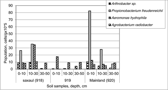 For the analysis, we selected four species of typical soil bacteria, such as aerobes Arthrobacter sp. and Agrobacterium radiobacter, optionally anaerobe Aeromonas hydrophila and anaerobe Propionibacterium freudenreichii. The population of Propionibacterium freudenreichii is substantially higher in the upper soil layer on the mainland as compared to the soil under saxaul. Population of other soil species under consideration is comparable with that on the mainland and in the soil under saxaul. The soil in the deeper layer (10 - 30 cm) under brush is richer in those species than the mainland, perhaps, due to exudates of saxaul roots that microorganisms use for their development and reproduction. The population of Aeromonas hydrophila only on the bare land is comparable with other soil conditions. To find a contribution of those species to the soil formation process, let’s examine their metabolic abilities.