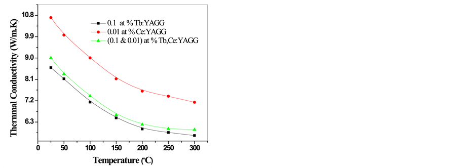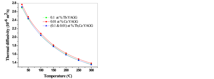 The variations in thermal diffusivity with the temperature of doped YAGG single crystals are shown in Figure 3. The thermal diffusivity decreases as temperature increases and its reduction is slower at higher temperatures. The thermal diffusivity of 0.1% Tb doped YAGG crystal at 25˚C was 2.696 × 10−6 m2/s and it reduced to as much as 51% to 1.36 × 10−6 m2/s at 300˚C. Figure 3 also demonstrates the small effect of cerium and terbium doping on thermal diffusivity. The values of thermal diffusivity at 25˚C for co-doped (0.01, 0.1)% Ce, Tb:YAGG and 0.01% Ce:YAGG single crystals were 2.714 × 10−6 and 2.77 × 10−6 ± 0.005 × 10−6 m2/s, respectively. The thermal diffusivity increases by increasing cerium concentration and there is slight change of thermal diffusivity between Tb:YAGG and Ce, Tb:YAGG single crystals but a prominent change is observed in Ce:YAGG single crystals.