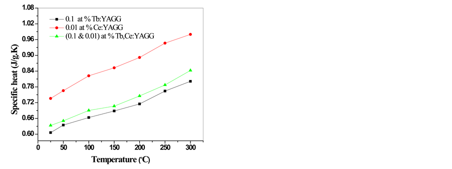 Figure 4 demonstrates the dependence of specific heat of doped YAGG crystals on the temperature. From the figure, it is clear that specific heat increases with temperature for all doped samples. Cerium and terbium doping concentration lead to the change in specific heat within the experiment temperature. The specific heat of 0.1% Tb:YAGG crystal shows lowest specific heat and approximately 76% change in specific heat is observed in the temperature range of 25˚C to 300˚C. The results show the cerium doping concentration has significant influence on the specific heat of YAGG single crystal.