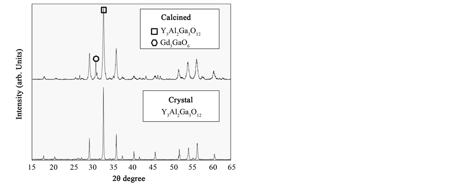 X-ray diffraction patterns of 0.01% Ce:YAGG calcined and crystal are shown in Figure 1. The calcined 0.01%