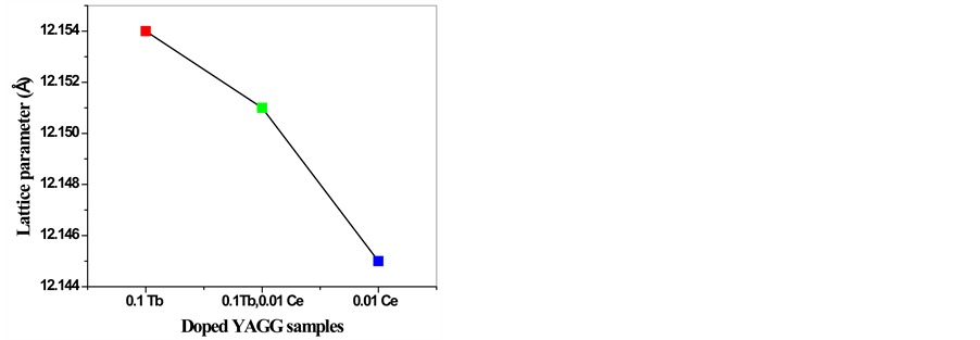 The lattice parameters of YAGG crystals as a function of cerium and terbium doping concentrations are shown in Figure 2. The lattice parameter increases with Tb doping. We suggest the presence of dopants form homogenous disorders due to defect, vacancies and/or stacking faults in the garnet structure which can cause the change in lattice parameters.