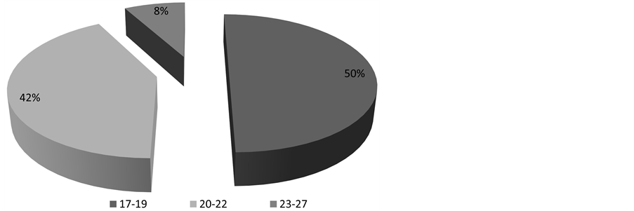 The results showed that our simpler is composed of 43% of boys and 57% of girls (Figure 1). The age of our population is distributed in 3 groups; 50% of students who are aged between 17 - 19 years, 42% aged between 20 - 22 and 23 - 27 (8%), (Figure 2).