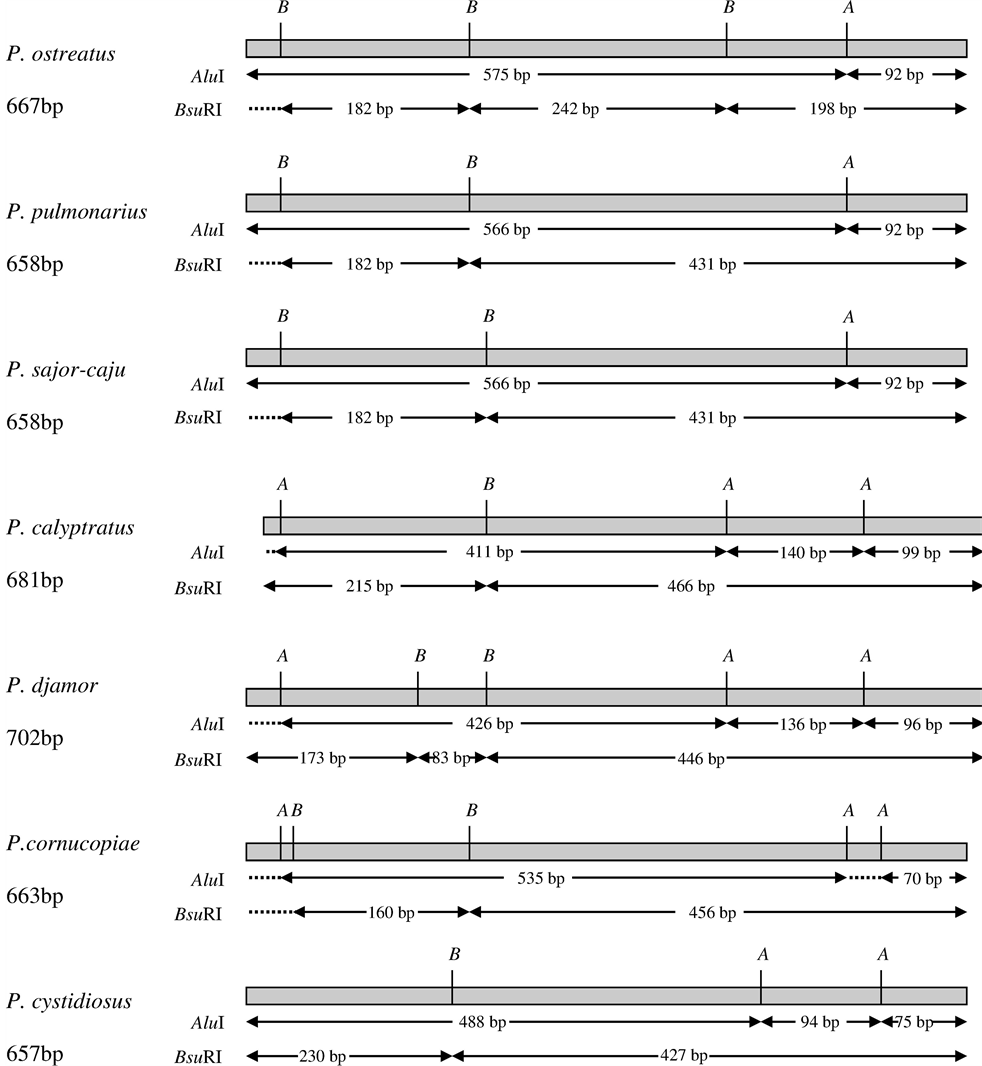 Figure 1. Molecular barcodes based on restriction enzyme digestion patterns of ITS1-5.8S-ITS2 region of rRNA gene cluster for Pleurotus species studied. ITS sequences for the restriction analysis were generated by PCR. ITS sequences within the genus Pleurotus are differed by their length (as indicated on the left in nucleotide base pairs, bp); number of restriction fragments in each pattern varies between 2 and 3 as detected in 1% agarose gel. Letters A and B on the top of each pattern corresponds to restriction enzyme sites: A = AluI, B = BsuRI; the fragment length is indicated in base pair, bp. The size and number of restriction fragments are species-specific and variable enough to be used for species differentiation.