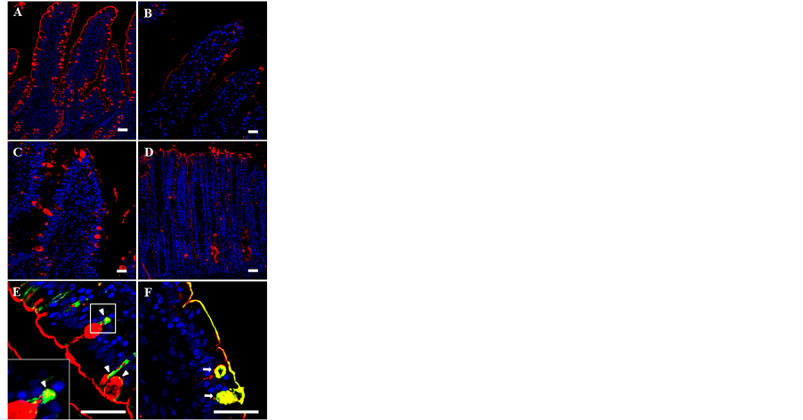 Figure 8. Localization of aldolase A in bovine small intestinal and colonic villous epithelium. Paraffin sections were immunostained with anti-aldolase A antibody in duodenal (A), jejunal (B), ileal (C) and colonic (D) sections. Duodenal goblet cells were dual immunostained with anti-aldolase A and anti-LAMP-1 antibody, as an endosomal marker (E), or MUC2 antibody as a mucous marker (F). Aldolase A was visualized with Alexa Fluor 594-conjugated antibody (red) and LAMP-1 and MUC2 were visualized with Alexa Fluor 488-conju- gated antibody (green). The sections were counterstained with DAPI. Bars = 20 µm.