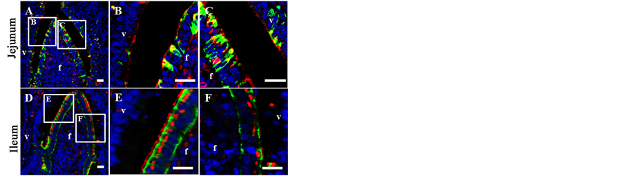 In the villous epithelium, aldolase A was detected on the surface of the epithelium facing the lumen and in the mucus droplet of goblet cells in duodenum, jejunum, ileum and colon (Figures 8(A)-(D)). Lamp-1, a late endos- omal maker [26] , was sometimes co-localized with aldolase A in the late endosome near by the mucous droplet of goblet cells (Figure 8(E)). Additionally, as MUC2 is known as a mucous marker of goblet cells [36] , it was co-stained with aldolase A on the surface of epithelium and in the mucous droplet of goblet cells (Figure 8(F)). These data indicate that aldolase A in the villi is produced and secreted by goblet cells. In the follicle associated epithelium (FAE) of bovine jejunal and ileal Peyer’s patches, aldolase A was localized on the surface and apical part of the microfold (M) cells along with CK 18, known as a bovine M cell marker [37] (Figure 9), as same as