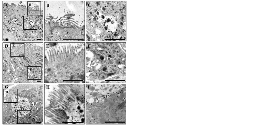 Figure 10. Immunoelectron microscopic ultrastructural localization of aldolase A in bovine intestinal epithelium. Immunoelectron microscopic sections were immunostained with anti-aldolase A antibody in M cell ((A), (B), (C)), absorptive epithelium cells ((D), (E), (F)) and goblet cells ((G), (H), (I)) of bovine ileum. Aldolase A was visualized with 15 nm gold particle-conjugated second antibody. B, C, E, F, H and I are higher magnifications of the boxes in (A), (D) and (G). Bars = 1 µm.