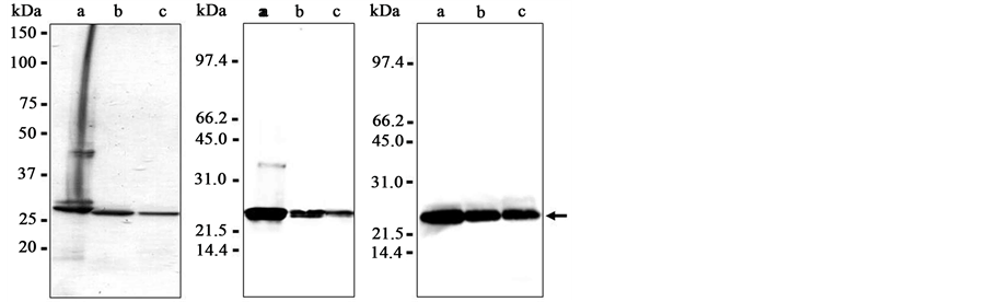 Recombinant bovine PrP (rbPrP) (aa 23 - 242) was expressed in E.coli from the modified pET-15b expression vector. Following purification and refolding in vitro, the recombinant protein was analyzed by Coomassie staining (Figure 1(A)) and Western blotting with 6H4 anti-PrP antibody (Figure 1(B)) or anti-His-probe antibody (Figure 1(C)). The protein had a molecular mass of approximately 26 kDa. After the refolding using a Ni-NTA