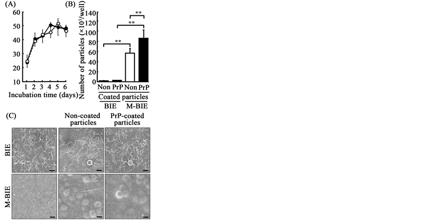 Figure 2. Transcytosis of prion protein coated particles of M cell-differentiated BIE cells. BIE cells were cultured in six Transwell inserts each for 3 days and stimulated with or without differentiation medium for another 3 days. In order to describe the permeable properties of tight junctions in undifferentiated (open circles) or M cell-differentiated BIE cells (closed circles), transepithelial electrical resistance (TER) was measured every day by using the Millicell-ERS (A). Non-coated or prion protein-coated particles were added to the apical medium. The basal media were collected after 9 h. M cell differentiated BIE cells (M-BIE) transported PrP-particles to a greater extent than “Non” particles. The transported particles were quantified using a FACScalibur flow cytometer (B). After washing with PBS, BIE cells were fixed with glutaraldehyde and coated with platinum-pal- ladium for SEM (C). Columns with anasterisk (**) indicate a statistically significant difference (p < 0.01). Magnification ×12,000. Bars = 1 µm.