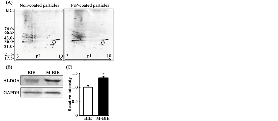 Figure 3. Identification of aldolase A as a PrP binding proteins in the vesicles of M-BIE cells. After M cell- differentiation of BIE cells, non-coated or PrP-coated magnetic particles were added to the apical medium. After 9 h, the vesicles containing magnetic particles were collected from M-BIE cells using a magnetic stand and then subjected to two-dimensional electrophoresis (A). Proteins in the gels were stained with a silver stain. The spot identified with a circle was the PrP-coated particles present at a much greater extent compared with the non-coated particles. The specific spot was excised and subjected to LC-MS/MS analysis, and this was identified aldolase A. The resulting identifications are summarized in Table 1. The expression levels of aldolase A in BIE and M-BIE cells were analyzed at a band of approximately 39 kDa by Western blot analysis (B). The band intensities of aldolase A (n = 6) were normalized with GAPDH and are presented as means ± SD by densitometric analysis (C). The asterisk (*) indicates a statistically significant difference (p < 0.05).