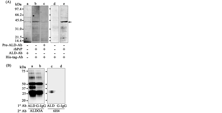 Figure 4. The binding of PrP to aldolase A by far-western blot analysis and immunoprecipitation. The cell lysate of BNP cells was separated by SDS-PAGE (A). The blot of this gel separation was subjected to Western blot analysis for anti-aldolase A antibody (a). The membranes were treated with rbPrP and then stained with anti-His-tag antibody as a probe in far-Western blot analysis ((b); (c); (e)). The binding of PrP to aldolase A was inhibited by pretreatment with the anti-aldolase A antibody (c). The lane d is a control as anti-His-tag antibody. The arrow in A indicates the aldolase A band.The mixture of rbPrP and aldolase Awas immunoprecipitated with goat anti-aldolase A antibody (ALD) or goat IgG control antibody (G-IgG) (B). Each immunoprecipitate was separated by SDS-PAGE and subjected to Western blot analysis with anti-aldolase A antibody (ALDOA) ((a) and (b)) or anti-PrP antibody (6H4) ((c) and (d)).