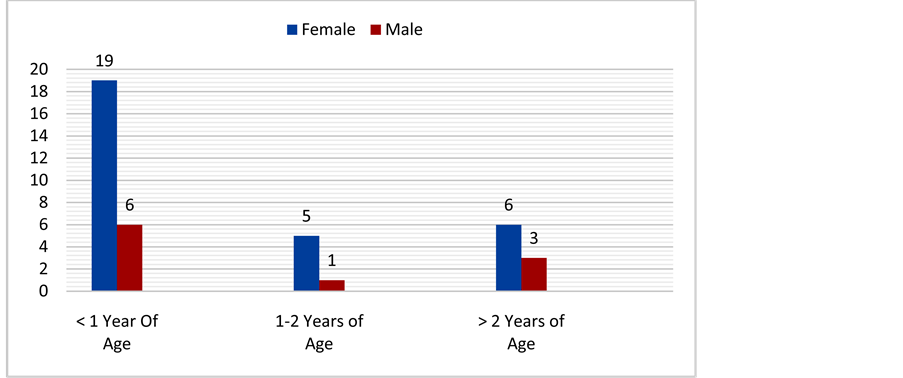 Amongst the 3 age group of evaluated pigs, the youngest group < 1 year) had the highest positive pigs (62.5%). Older groups represented 15% (1 - 2 year) and 22.5% (>2 year). The results are presented in Table 2. Statistical analysis applying Fisher’ exact test revealed no statistical significance between pigs of <1 year and 1 - 2 year age (p value 0.0765) and between <1 year and >2 year (p value 0.2501), however, the difference of positive cases was statistically significant in pigs of age 1 - 2 year and >2 year. Seropositive pigs by age and sex are presented in Figure 2, age and seropositivity in scatter graph (Figure 3) and graph plot (Figure 4).