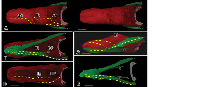 Figure 5. Total rendered images of the mouse tongue muscles. Red: sLo group, Green: iLo group, Yellow broken lines: the direction of muscle fascicles. *mark: iLo. Bar: 30 µm. (A) Dorsal part; (B) Inferior part; (C) Lateral part; (D) Separated iLo group; (E) Separated sLo group.