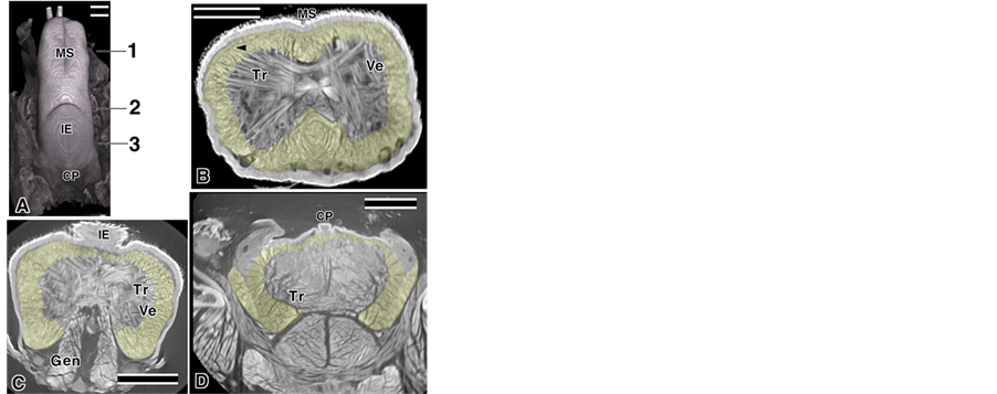 The tongue muscles and their surrounding tissues were recorded using micro-CT and the Aoyagi method [19] . Two types of observation were performed: a low magnification for the entire tongue image (Figure 1(A), Figure 5) and a high magnification for the muscle fascicle images (Figures 1(B)-(D), Figures 2-4). In this study, we focused on the muscle fascicles that ran from anterior to posterior, such as the Lo, Sty, and Hyo. Those muscles were roughly selected in the tomography of the micro-CT and were highlighted in yellow (Figures 1(B)-(D)). Tr present in the region of interest were bypassed in the cases where the Tr ran into the Lo (Figure 1(B) arrowhead). In this research, all epithelium images were cropped by image processing and two types of depictions are presented in the Figs. The first type was a weak transmitted image: the figure near the surface in the 3D images was emphasized and most of the images were this type. The second type was a strong transmitted image: the figures in the deep areas in the 3D image were shown in addition to the surface ones. In several cases, the figures were shown as convergent stereo-pairs of reconstructed images.