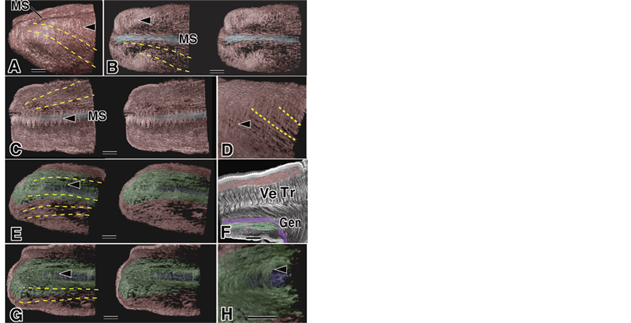 Figure 2. Apical part of the tongue using micro-CT. Red: sLo group, Green: iLo group, Yellow broken lines; the direction of muscle fascicles, Blue: mMS below MS, Purple: Gen. A pair of pictures: stereo-pair of images. Bar: 10 µm, (A) Apical part, Arrowhead: mST; (B) Dorsal part. Arrowhead: mST; (C) Inside view. Arrowhead: Jointed between of the sLo; (D) Strong transmitted image of (A). Arrowhead: mST; (E) Inferior part of (A). Arrowhead: Jointed between iLo; (F) Tomography sagittal cut with Gen. Arrowhead: same as (E), (G). Inside view. Arrowhead: Surrounding the Gen; (H) Enlargement (G). Arrowhead: same as (G).