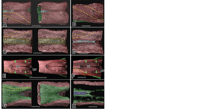 Figure 3. Middle part of the tongue using micro-CT. Red: sLo group, Green: iLo group, Yellow broken lines: the direction of muscle fascicles, Blue: mMS below the MS, Purple: Gen. Bar: 10 µm. (A) Middle dorsal part, with the mMS, mIE and iLo groups. Arrowhead: mST; (B) Lateral view with iLo group. Arrowhead: mST; (C) Inside view surrounding the mMS: in yellow; (D) After removal of the yellow part; (E) Middle dorsal part with iLo group. Green arrowheads: mIE near IE; (F) Inside view. Green arrowheads: same as (E), (G). bottom view. Arrowhead: jointed between the iLo group; (H) Horizontal cut through the Gen.