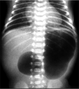 On the second day of life, there was a persistent vomiting even with an open gastric tube and the baby was submitted to a radiologic procedure that showed an enlarging of the gastric image and a second at the duodenum site, strongly suggesting a double bobble image of CDO (Figure 1).