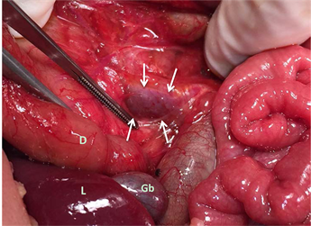 Figure 2. White arrows show PDPV obstructing Duodenum (D). Below D it is the Liver (L), Gallblader (Gb). Tweezer is over the duodenum mesentery close to the duodenum narrowing behind PDPV.