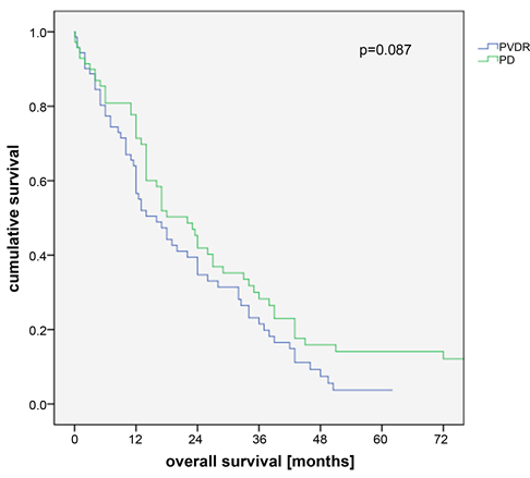 The authors’ analysis shows a significantly lower rate of R0 resections in the PDVR group (53.52 vs. 71.83 %, p = 0.024). Further investigation of the PDVR subgroup reveals that especially histopathologically proven venous tumor infiltration is associated with a higher incidence of R1 resection status (47.62%). This finding may be one of the reasons for the reduced overall survival of these patients [36] , as written below, and can be supported by former studies: Malleo et al. [34] report a significantly higher incidence of R1 resection status of 60.7% vs. 35.6%, if the tumor infiltration into the venous wall could be confirmed, maybe due to the close proximity of the tumor to the superior mesenteric artery neural plexus [13] .