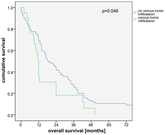 In contrast, the median overall survival of patients with histopathologically proven tumor infiltration into the venous wall was significantly worse than the survival rate of those without venous tumor infiltration [11] (12 months, 95% CI 10.97 - 13.34 vs. 19 months, 95 CI 13.67 - 24.33; p = 0.048). As reported by Giovinazzo et al. [11] one reason for this finding may be the association between venous tumor infiltration and an increased rate of disease residual (R1), although the resection status (R0 vs. R1) does not reach statistical significance (p = 0.066) in the present univariate analysis.