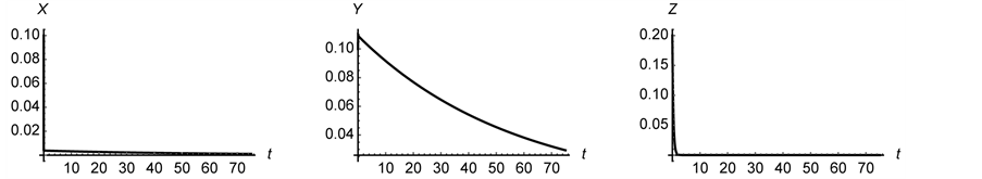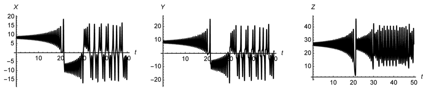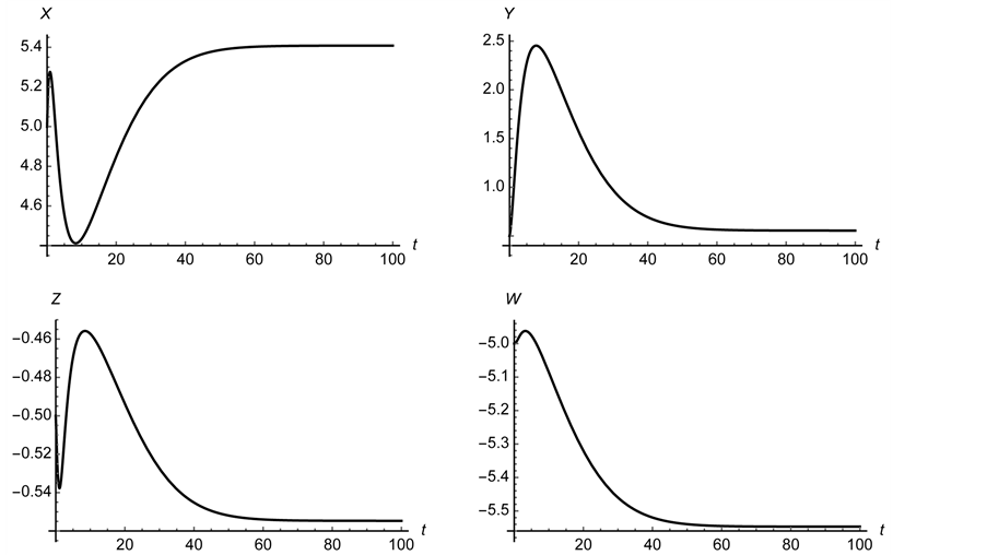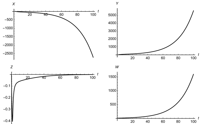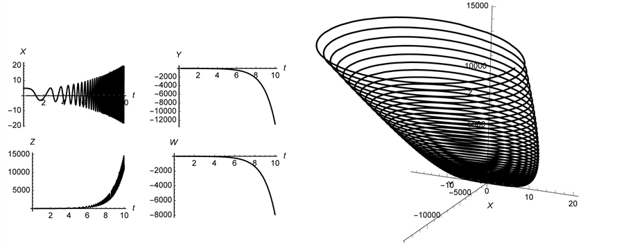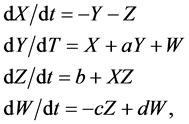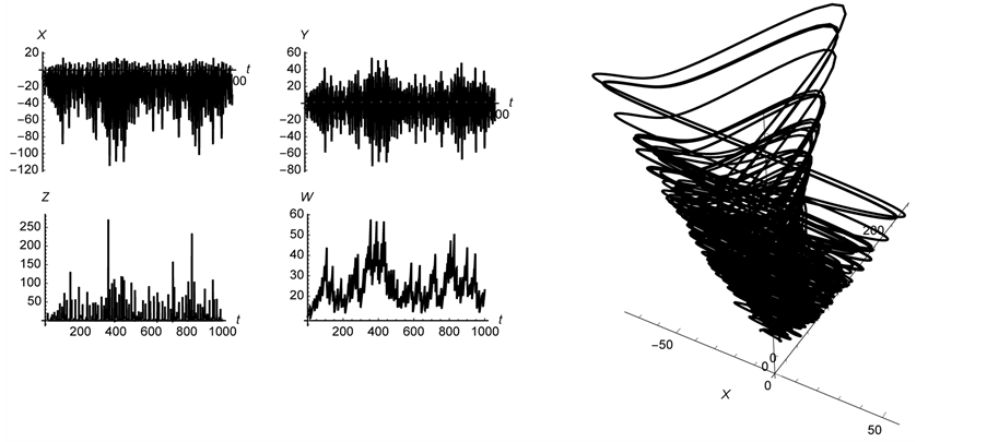 where a, b, c, and d are positive constants can exhibit more complex behavior than system (4). System (5) is interesting because depending upon the parameter values and initial conditions chosen, the system can exhibit hyperchaos, which is illustrated in Figure 10 using the parameter values