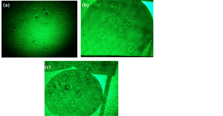 The nonlinear refractive index arises from local variation of the refractive index with temperature. The absorption of the focused beam propagating through the sample leads to a spatial variation of temperature in the sample and, consequently spatial variation of refractive index that acts as thermal lens resulting in the phase distortion of the beam. Figure 2 shows photographs of the variation of the spot size as a function of the sample position relative to the lens focal point: prefocus transmittance maximum (Figure 2(a)), postfocus transmittance minimum (Figure 2(c)).