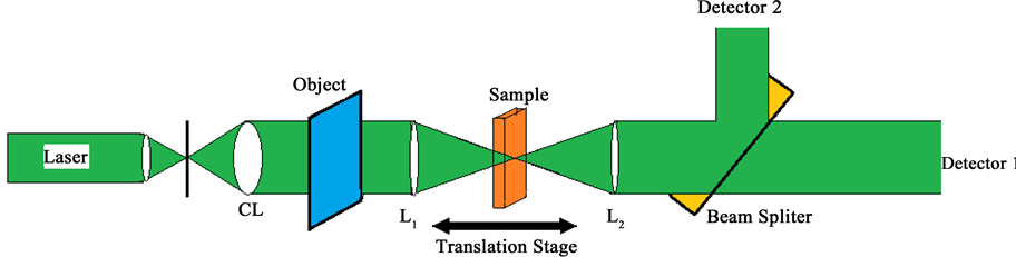two parts, one part of the transmitted beam is imaged on a screen at the back of the lens L2 and the other part is detected by the detector to obtain nonlinear properties of the sample. By shifting the sample through the focus, the beam intensity and/or spatial profile is recorded. These variations of the intensity during z scan can be used to block different spatial frequency bands of the Fourier spectrum of the image. The continuous band blocking filtering can be achieved by controlling the movement of the sample through the focus of the laser beam. Therefore no neutral density filters are needed.