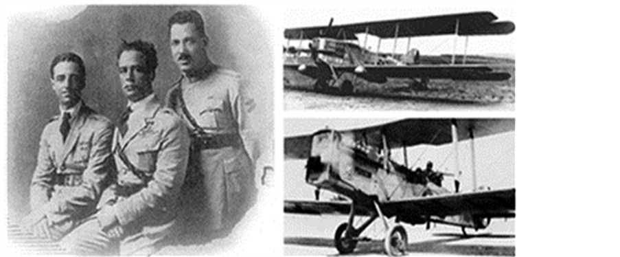 In 1923 Gago Coutinho and Sacadura Cabral were contemplating to perform an Around the World Flight. However, Sacadura died in 1924, while piloting an airplane acquired for the circumnavigation voyage. Also in 1924 the pilots Brito Pais and Sarmento Beires idealized the conducting of a trip to Macau as an aspiration for a future Portuguese around the World Flight attempt. On 7 April 1924, those pilots departed from Vila Nova de Milfontes in a Breguet XVI Bn2 airplane, beginning a trip to Macau. On 7 May an engine failure forced them to crash in India. On 30 May they managed to continue the Voyage in a De Havilland DH9 aircraft before being forced to end their attempt in 20 June in flying over Macau. A typhoon hindered their efforts to land and the airplane was crash landed in Chinese Territory about 800 meters from the Hong Kong Border. On 25 June 1924, they were shuttled back to Macau by boat. Brito Pais, Sarmento Beires and Manuel Gouveia returned to Portugal, via North America, visiting several Portugueses nuclei at China, Japan, United States and England. They went to Portugal on 9 September, after having flown a total of 16,760 kilometers in 117:41 h facing often extremely adverse atmospheric conditions, sandstorms and inaccurate navigation maps [8] . Figure 3 illustrates the navigators and the airplanes used along the First Aerial Journey from Portugal to Macau.