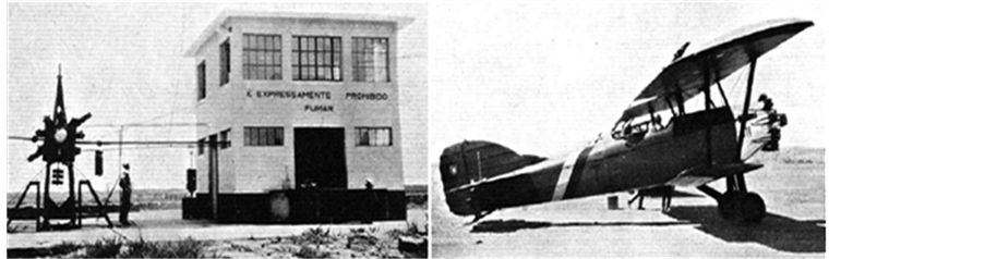 The Alverca workshops were very well equipped, and were adequate for the volume of work they were called upon to handle. A careful system of checking and testing, under the supervision of Engineer-Officers of the Aeronáutica Militar, together with an elaborate costing system, was employed. Alverca also possessed an efficient workshop for wooden wing construction, and another for the manufacture of wooden airscrews. Airscrews are supplied to the Military and the Naval Air Force. As regards aircrafts, several types were constructed under license that time in Alverca: the Potez XXV, the Vickers Valparaiso (Type 93 Valparaiso I, Type 92 Valparaiso II and Type 168 Valparaiso III) and the Pou-du Ciel (Flying Flea). The majority of the engines in the airplanes of the Military Air Force are Bristol “Jupiter’s” and all of this make have either been totally constructed at Alverca, or else parts constructed from parts imported in the rough and machined up and assembled in the Alverca Workshops [12] . Figure 5 illustrates the Alverca facilities and a Potez XXV airplane entirely built at Portugal.