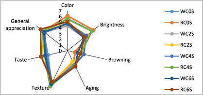 Figure 10. Sensory profile of cola nuts during conservation depending on treated with glucose syrup. WC0S: white cola nuts control; RC0S: red cola nuts control; WC2S: white cola nuts at 2 weeks; RC2S: red cola nuts at 2 weeks; WC4S: white cola nuts at 4 weeks; RC4S: red cola nuts at 4 weeks.