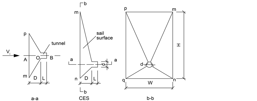 the height of the sail, respectively. L and d are the length and the diameter of the tunnel, and Vi is the inlet velocity. A drilled hole connected with a tunnel is designed to guide the air into turbine for electrical generation.
