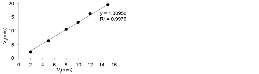 Figure 7 shows the relationship between wind speed (Vi ) and the velocity in tunnel outlet (Vo). From Figure 7, it can be seen that Vo is in direct proportion to Vi, and the fitting curve shows their approximate relationship as follows: