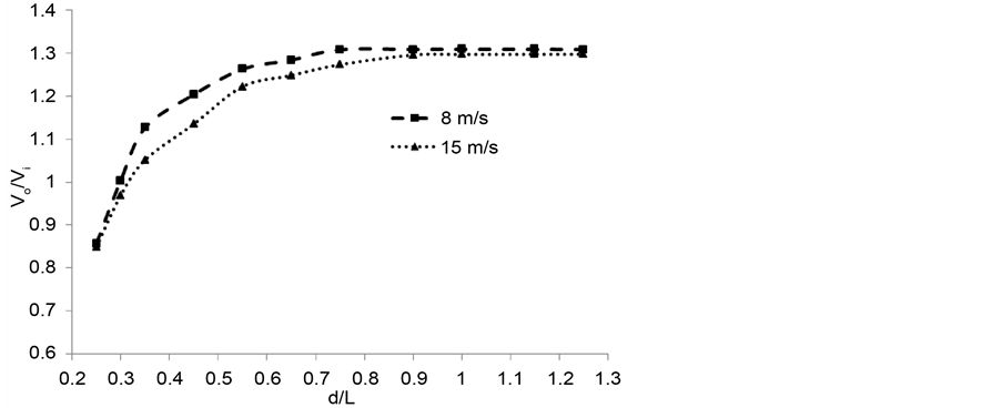 From the two curves in Figure 9, it can be seen that Vo increase exponentially with the tunnel diameter when the diameter ratio is less than 0.6, and then its increment slows down when the axis value increase from 0.6 to 0.8, and there is little variation when d/L is larger than 0.8. Comparing the two curves, it can be found that the frequent and the high velocity seem alike all the time especially with thicker tunnel. From Figure 9 we can also see that in order to obtain Vo much more than Vi(Vo/Vi > 1), d/L should larger than 0.35, which means the tunnel begin to work to accelerate the air flow in it. Since the ratio d/L is more than 0.8, Vo will not increase substantially, so in this case 0.8 is an optimized ratio.