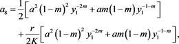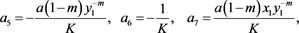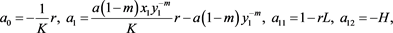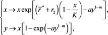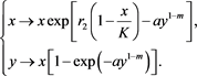 where is the host population size in generation t, is the parasitoid population size in generation t. The constant a indicates the searching efficiency and m is the interference coefficient. The host grows logistically with the carrying capacity K and the intrinsic growth rate r.