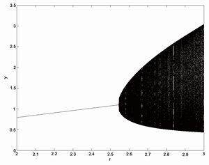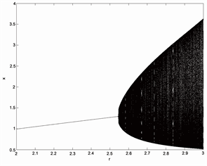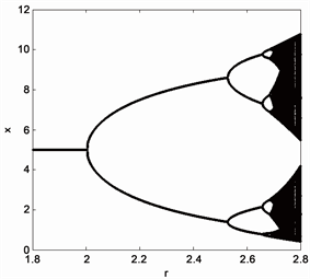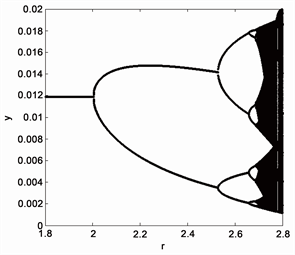 Figure 1. (a) Bifurcation diagram for x − r; (b) Bifurcation diagram for y − r.