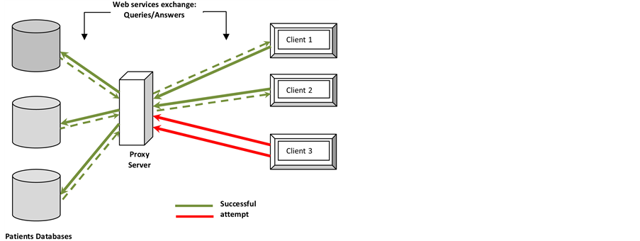 Figure 1. Successful web services queries to access the patients databases by registered clients in the proxy server and an unknow client (Client 3).