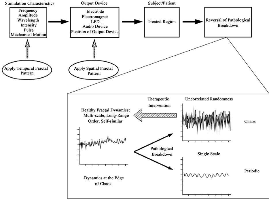 The implementation of a fractal pattern for stimulation therapies must be taken on an individual or situational basis. The adjustable parameters that are selected to contain a fractal sequence should be relevant to producing an optimal treatment based on the principle mechanisms of the stimulation modality. Many physiological mechanisms operate on the basis of having a threshold limitation where a stimulus may not have the desired effect until it reaches a certain threshold. Therefore, an understanding of the therapeutic methodology and underlying principles would be necessary to experiment with fractal stimulation. Figure 5 shows possible configurations where a fractal system can be applied and how it should affect the physiology of the subjected patient.